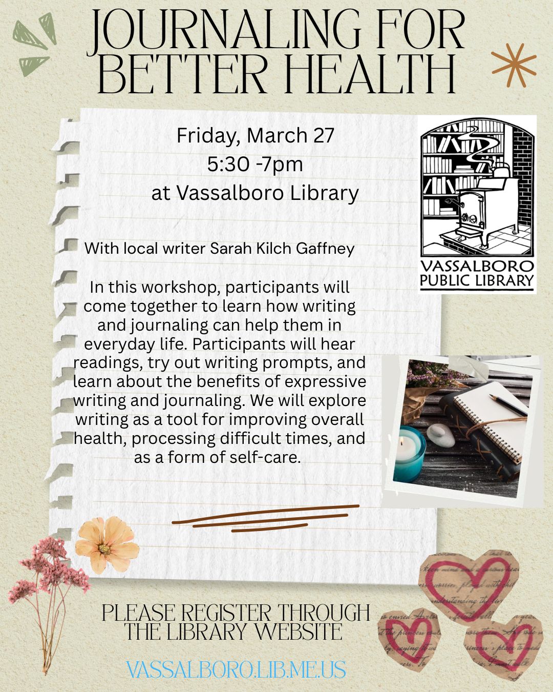 March 27, 2026 @ 5:30 PMJournaling for Better Health – with Sarah Kilch Gaffney March 27 from 5:30-7pm at Vassalboro Public Library Please register here: https://forms.gle/m4nLe9WBFKCg5t3V9 In this workshop, participants will come together to learn how writing and journaling can help them in everyday life as they navigate challenges both personal and professional. Participants will hear readings, try out writing
